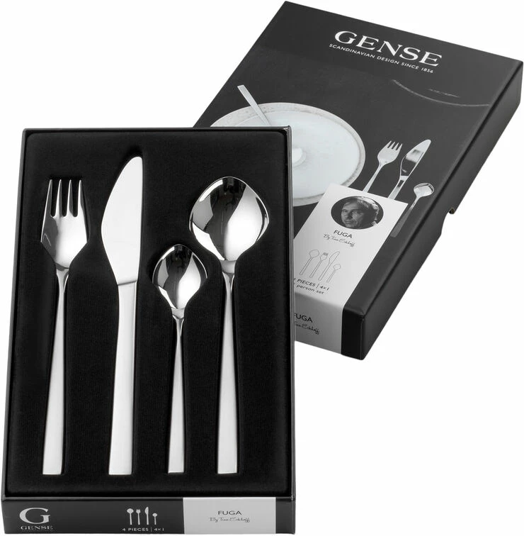 Genses bestik Fuga er ideelt til hverdagslivet såvel som til festlige lejligheder. Fuga har et klassisk design med blødt afrundede linjer, der hviler behageligt i hånden. Tias Eckhoff formgav det ikoniske bestik i 1962, der i sit design formidler klarhed og præcision, men med et subtilt udtryk. Design Tias Eckhoff, født 1926, var blandt dem, der bidrog til at gøre skandinavisk design til et verdenskendt begreb. Han var kunstner og samtidig pioner inden for industrielt design. Hans bestik sælges over hele verden og er i dag repræsenteret på nogle af verdens mest kendte designmuseer.