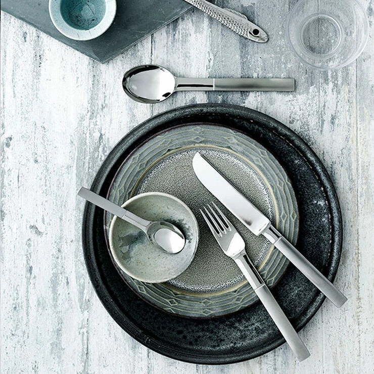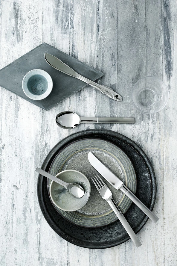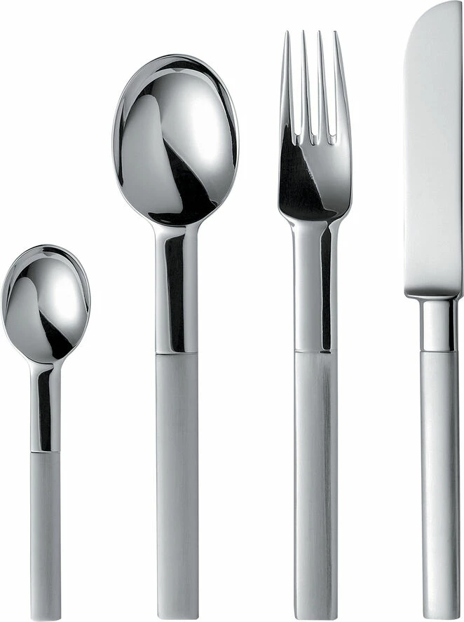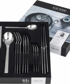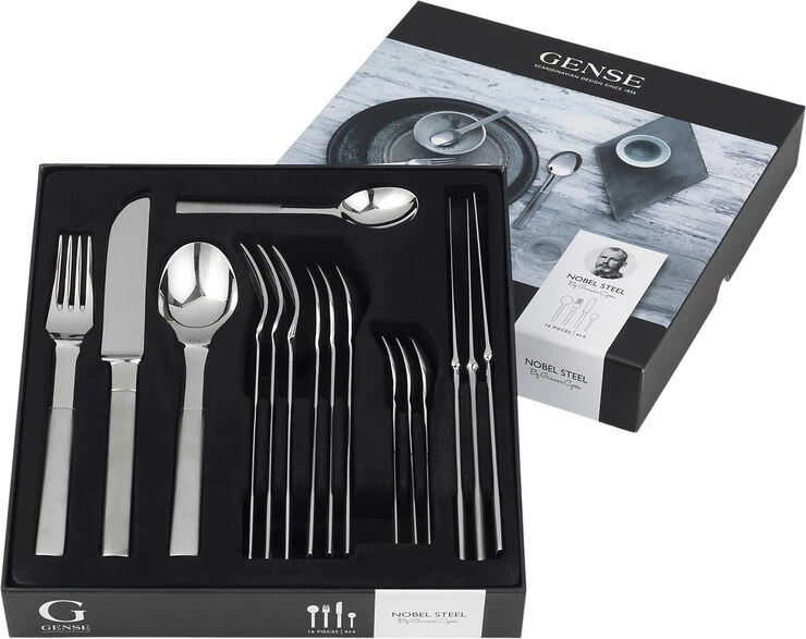 Nobel blev designet til Nobels 90 års jubilæum. Nobel er tydelig svensk i sin form og har mange overraskende detaljer. Denne æske indeholder 4 knive, 4 gafler, 4 spiseskeer og 4 kaffeskeer