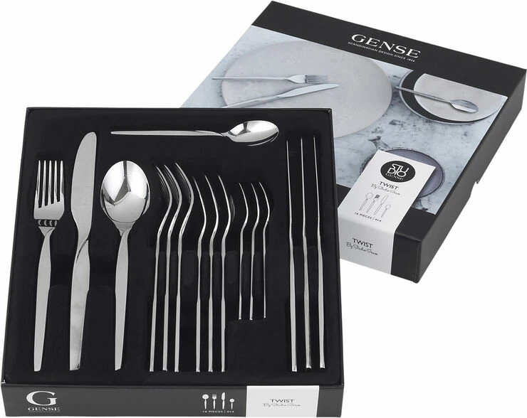 Twist har fået navnet ud fra designet på bestikket, hvor hver del har en et “twist” øverst på skaftet. Bestikket er udført i rustfrit 18/0 stål, hvilket betyder at bestikket er nikkelfrit, hvilket er en stor fordel hvis du lider af nikkel allergi. Twist er blankpoleret og tåler opvaskemaskine. Gaveæsken indeholder: 4x Kaffeskeer, 4x Spiseskeer, 4x Bordgafler, 4x Bordknive. Der findes mange dele i serien, som kan fås i Magasins boligafdeling.