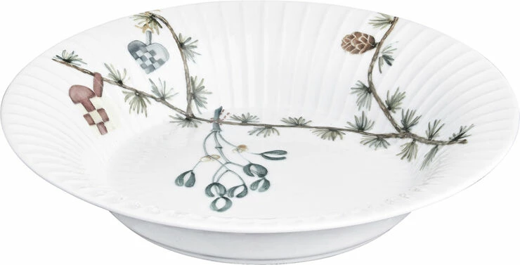 Som resten af Hammershøi Jul-serien, har den dybe tallerken de ikoniske Hammershøi-riller og de spændende juledekorationer. Detaljer som lærkegrene i stedet for gran og en snemand giver designet en moderne twist, mens nøddeknækkere, hjerter, stjerner og trompeter holder de klassiske juletraditioner i hævd.