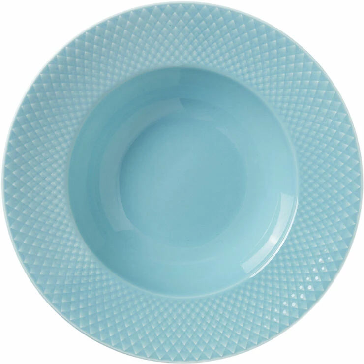 Rhombe Colors markante og moderne farver er udviklet i samarbejde af designduoen Stilleben, der ligesom Lyngby Porcelæn er drevet af en passion for nye idéer og et ønske om at genopdage og gentænke den keramiske arv. Rhombe Color Dyb tallerkenen kommer nu i en moderne turkis nuance, der sammen med de andre glasurer giver stellet en kunstnerisk kant og et moderne udtryk, og inviterer til at være kreative med borddækningen og udforske stellets kombinationsmuligheder. I alt kommer de fire forskellige eksisterende tallerkener i seriens blå farvepalette, og herunder Ø24.5 cm i den turkis farve. De blå nuancer, der spænder fra det klare vand til den midnatsblå himmel, er skabt til at kunne bruges på kryds og tværs med seriens andre dele, men står også smukt sammen. Design Stilleben