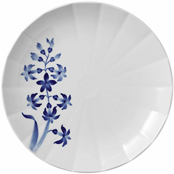 De bedste designs er ofte dem, der ikke ser anstrengte eller komplicerede ud, men derimod lette og tilgængelige. Med blomst-serien har designerne brudt med den mere traditionelle, centralt placerede buketdekoration fra Blå blomst. I stedet er alle elementer hver i sær prydet med deres egen individuelle, unikke blomst, for at opnå et mere moderne og underspillet udtryk. Tallerkenens bløde coupe-form tillader det håndmalede blomstermotiv plads til at gro frit, og den klare blå, asymmetrisk-placerede blomst står i kontrast til den hvide overflade. Uhindret af grænser og ydre kanter synes blomsterne næsten at vokse ind på tallerkenen og fremtræder dynamiske og livlige.