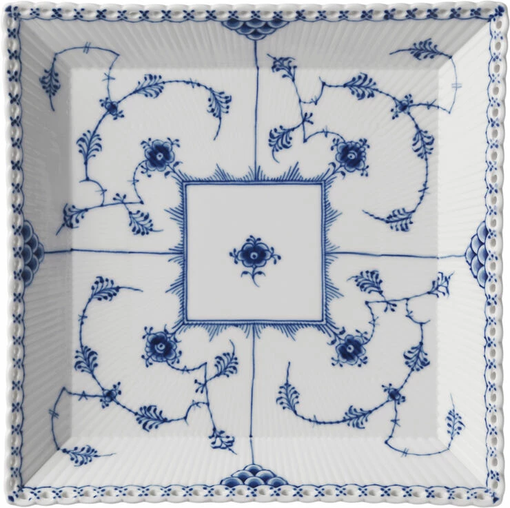 Den største af to kvadratiske tallerkener i Musselmalet Helblonde har en størrelse på 21 cm, hvilket gør den ideel som frokosttallerken eller til servering af tapas og andre små retter. Ligesom den mindre tallerken er kanten dekoreret med en delikat, håndlavet blonde, mens tallerkenstørrelsen giver det florale mønster sit helt eget udtryk. Det intenst smukke Musselmalet Helblonde-stel står som et pragtstykke på det ypperste inden for porcelænshåndværk. Hver eneste lille gennemboring i blondekanterne er omhyggeligt udstukket i hånden og derefter delikat indrammet af det musselmalede mønster. En evig klassiker skabt med stor passion.