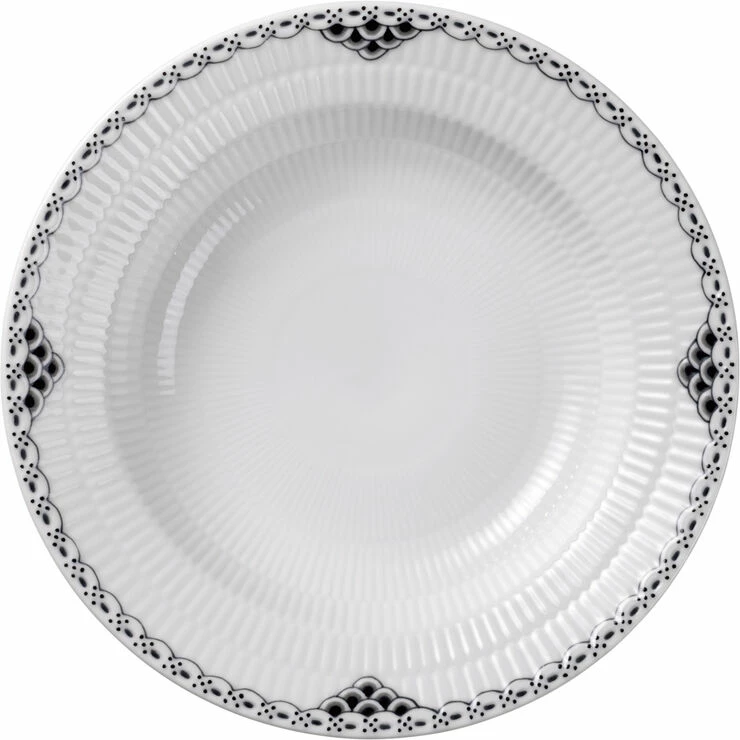 Sort Riflet Blonde’s dybe tallerken er kendetegnet ved det klassiske riflede design og den bemalede blondekant. Tallerkenen passer smukt sammen med de andre i Sort Riflet Blonde-kollektionen eller måske med de blå eller hvide stykker fra Royal Copenhagens øvrige stel.