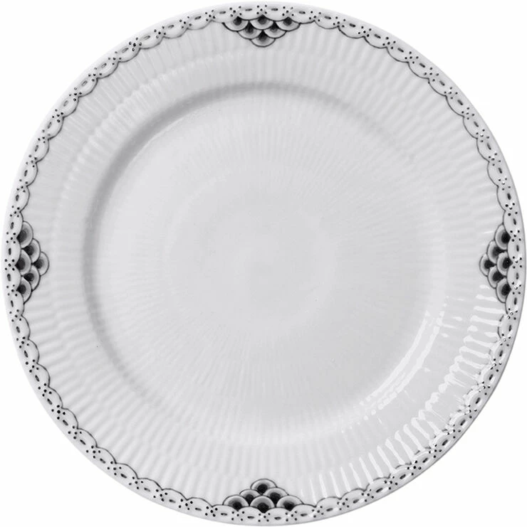 Den 19 cm Sort Riflet Blonde tallerken er den mindste i kollektionen. Den elegante blondekant fungerer som en smuk ramme til søde desserter eller lækre oste. Den sortes dristighed blødes op af kniplingsdekorationernes delikatesse.